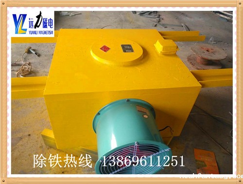 产品简介:风冷电磁除铁器可清除混杂在散状非磁性物猜中的铁磁性物品 其内部接纳电工专用树脂浇注,自冷式全密封布局,具有磁透深度大,吸力强等特点 它